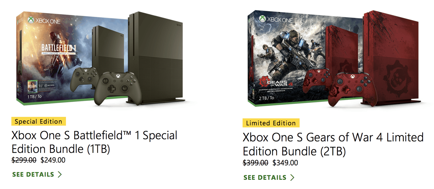 The most interesting bundle you may want to check out is probably the Xbox One S Battlefield 1 Special Edition bundle, which comes with a Military Green 1TB console, controller and stand, Battlefield 1 Early Enlister Deluxe Edition plus one month of EA Access. If you’re looking for more storage, the Xbox One S Gears of War 4 Limited Edition ($349) comes with a 2TB hard drive plus a gorgeous “Crimson Omen” console and controller.