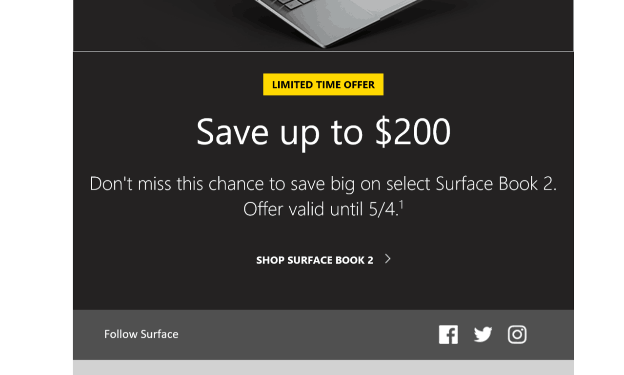 1 Offer valid 4/21/2019–5/4/2019 on select Surface Book 2 devices. Pen not included. See product page for more details. While supplies last. Limit 3 per customer.