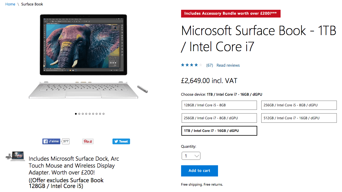 For a limited time, the UK Microsoft is also offering a free Accessory Bundle worth over £200 along the purchase of all Surface Book models except the base one with only 128GB of storage. This bundle includes Microsoft’s Surface Dock, Arc Touch Mouse and Wireless Display Adapter, which will all add great value to your Surface Book purchase.