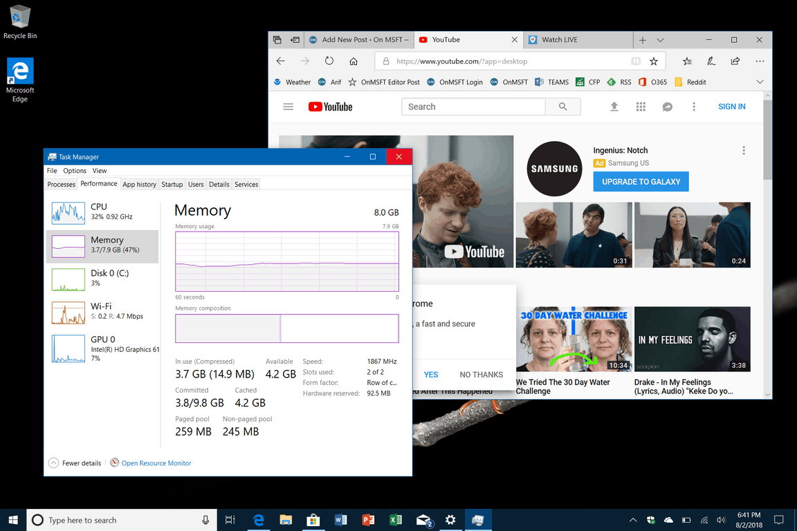 Anyway, once things booted up, I went through the usual process of customizing my colors and Start menu, verifying my Microsoft Account Identity. Doing this alone, the RAM usage was at 3.9/7.9 GB. It was obvious to me that Surface Go probably needed an update, so I manually triggered Windows Update before proceeding with customizing. A long list of updates was available, including new Surface drivers, and this month’s cumulative update (it comes running build 17134.112, from June.) It took the device a good 20 minutes to download everything, and an additional 3-5 minutes to install.