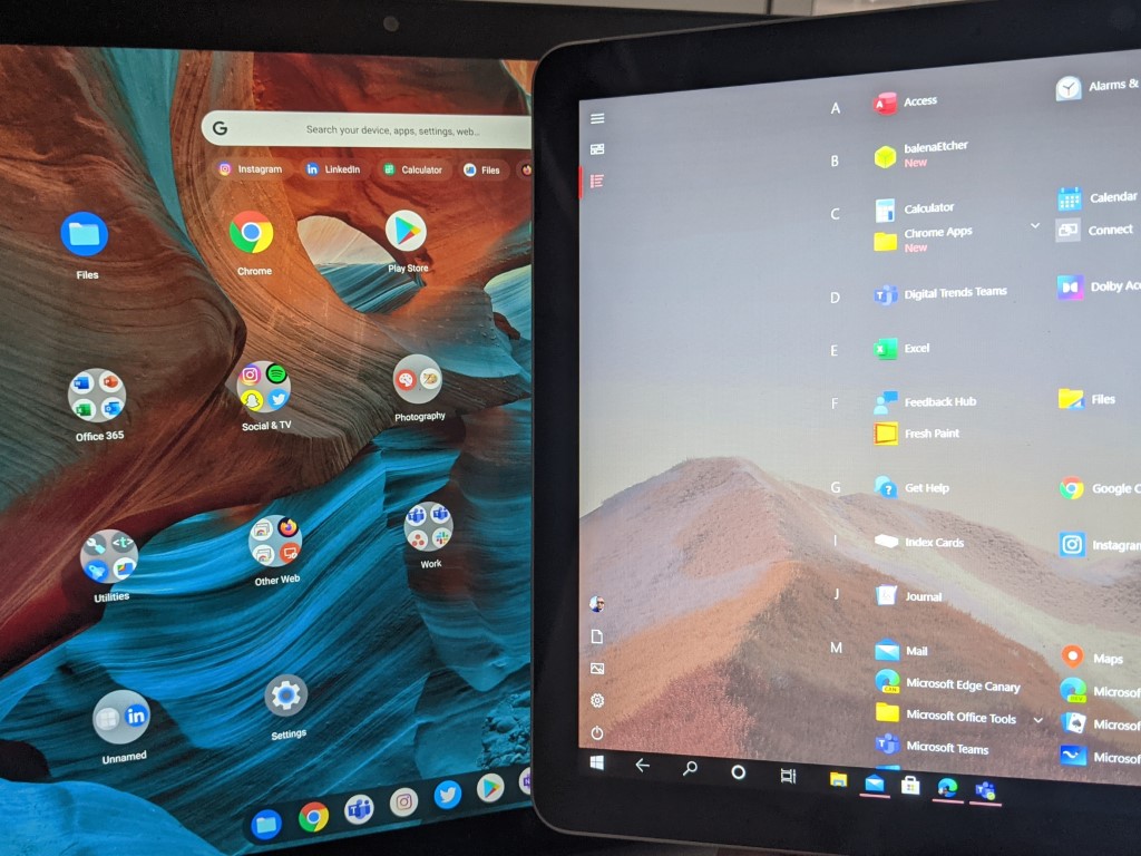 But the Windows 10 tablet mode mixes things up a bit too much for my liking. You get both your Live Tiles, as well as an option for a list of static apps. The list of static apps is the clearest, as my colleague pointed out to me, but it’s still a scrollable list and doesn’t have easily show or has a list of folders, as it is in Chrome OS. Lessons learned for Microsoft, as Windows 10X has a similar home screen.