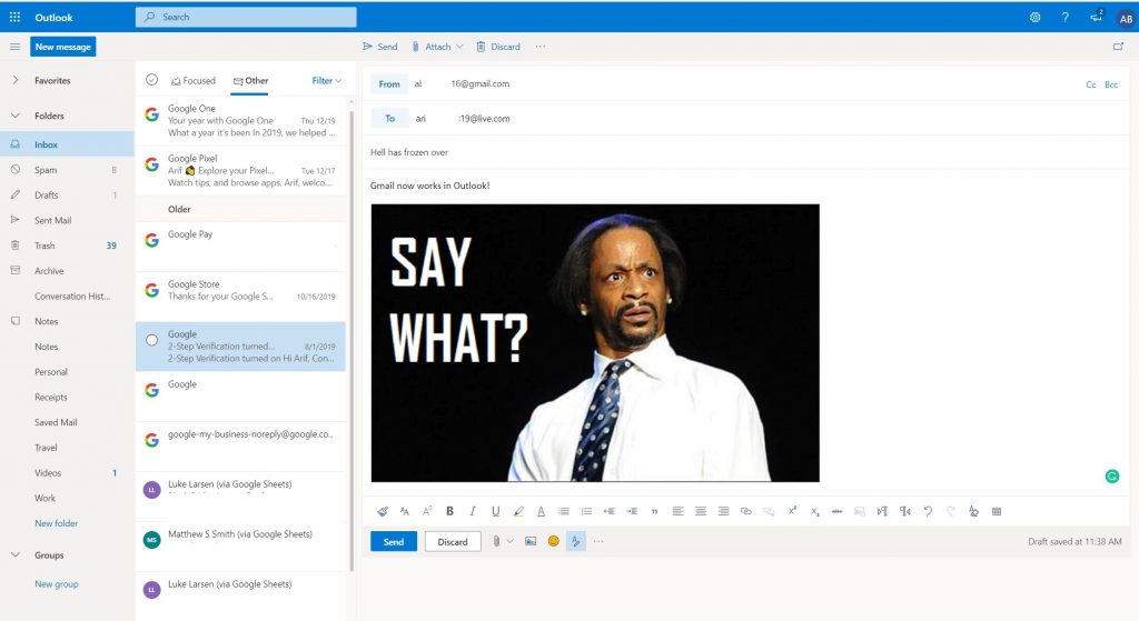 At the end of the day, it is indeed quite convenient to have access to Gmail directly from within Outlook.com, as it moves the experience closer to what you get with the dedicated Outlook app. You’re able to access your emails, calendar, and even send Google Drive files without having to open Google’s own websites, and it is great for those who prefer the user experience out Outlook.com. The experience still has quite a ways to go, but I am glad to see the new Microsoft in action and playing nice with Google services. That will be especially important with the Android-powered Surface Duo coming up later this year.
