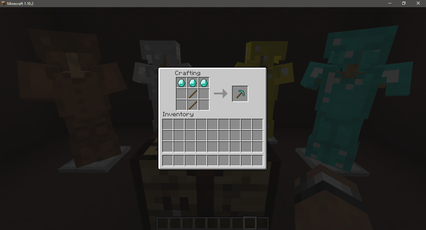 Once you have the basics down and a few chunks of wood, hit your Inventory button to bring up the interface. Here you can see what armor pieces you have equipped as well as any objects you are carrying. Furthermore, a small 4×4 chunk will let you craft some small items. Place your wood in one of those slots to create wood planks. Then use a wood plank in each of those slots to create a crafting table. This table is able to be placed in the world by using your right click mouse button. Notably one of the most used items in the game, the Crafting Table makes it possible to build and upgrade your tools, create armor, and much much more.