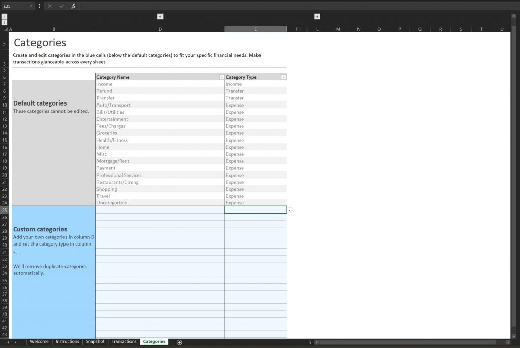 The final sheet you’ll notice in Money in Excel is the Categories sheet. On this sheet, you’ll see a list of 18 default categories, which can not be changed. These categories are for different types of financial activities, be it income, refunds, transfers, bills and utilities, entertainment, groceries, and more. All of these show up across all sheet, and help you find transactions at a glance. You’re free to add your own categories in the blue section and set the type. It is great to see this level of control.