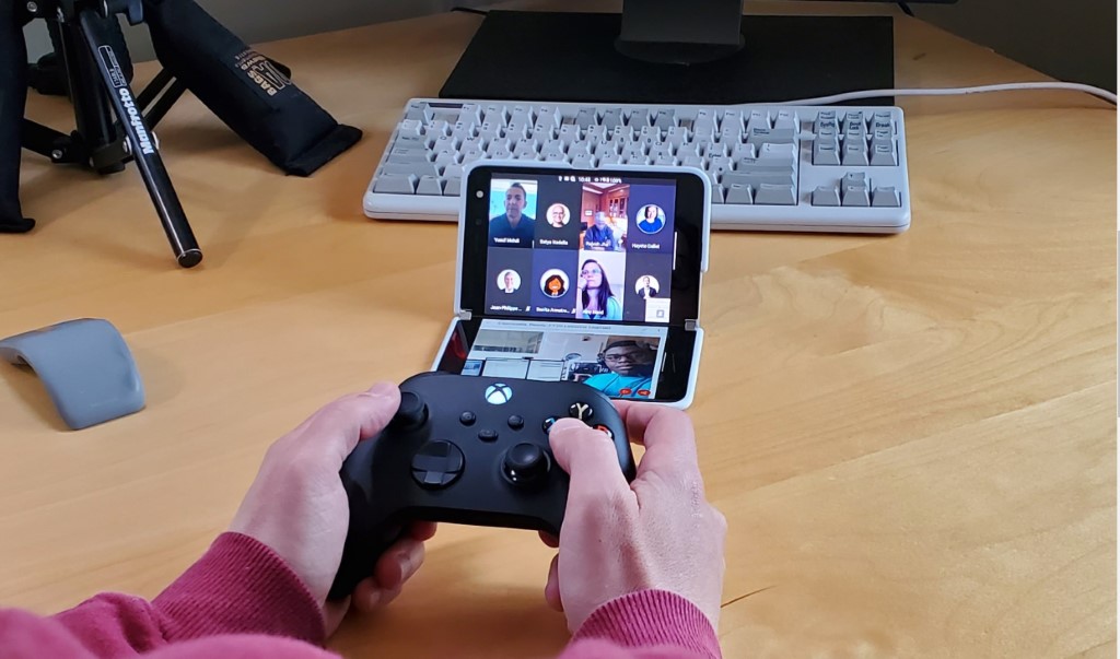 In the tweet from Microsoft’s Chief Marketing Officer and Executive Vice President of Consumer Business, we can see the executive playing Minecraft on a second screen, while in a Teams meeting on his Duo. He’s using the upcoming new Xbox X Series controller to play, and an interesting keyboard is under his monitor. However, what’s more important is what shows up on the screen of his Surface Duo (as seen in the featured image above.)