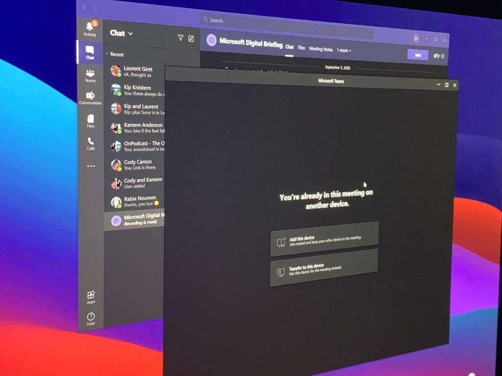 - Join a meeting from another device on a PC: At login, you should see a banner appear at the top of Microsoft Teams, letting you know that you’re in a meeting on another device. Of course, you’ll want to click the purple Join button next to this message, then choose Transfer from another device.