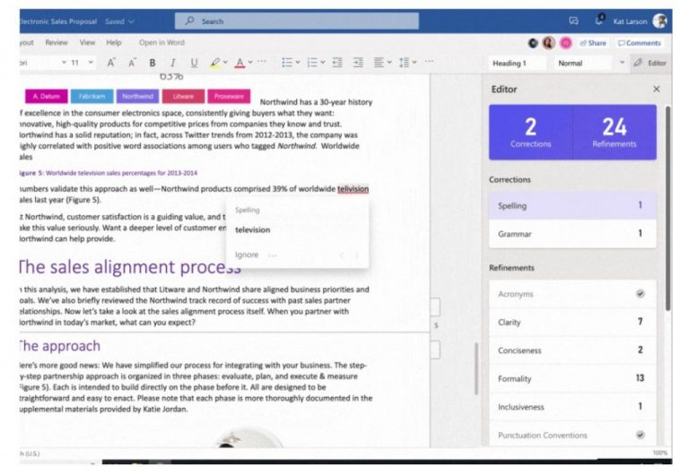 As for specifics on these features, the Editor element in Word will available as a right-panel inside the app and on the web. It will provide some suggestions for common writing tasks. This includes checking for plagiarism, spelling, suggestions on how you can rephrase and rewrite sentences, or replace words to be more inclusive in your writing. Microsoft says it will also be available in over 20 languages. Editor is also coming to Outlook.com, and as a standalone browser extension for Microsoft Edge and Google Chrome, too.