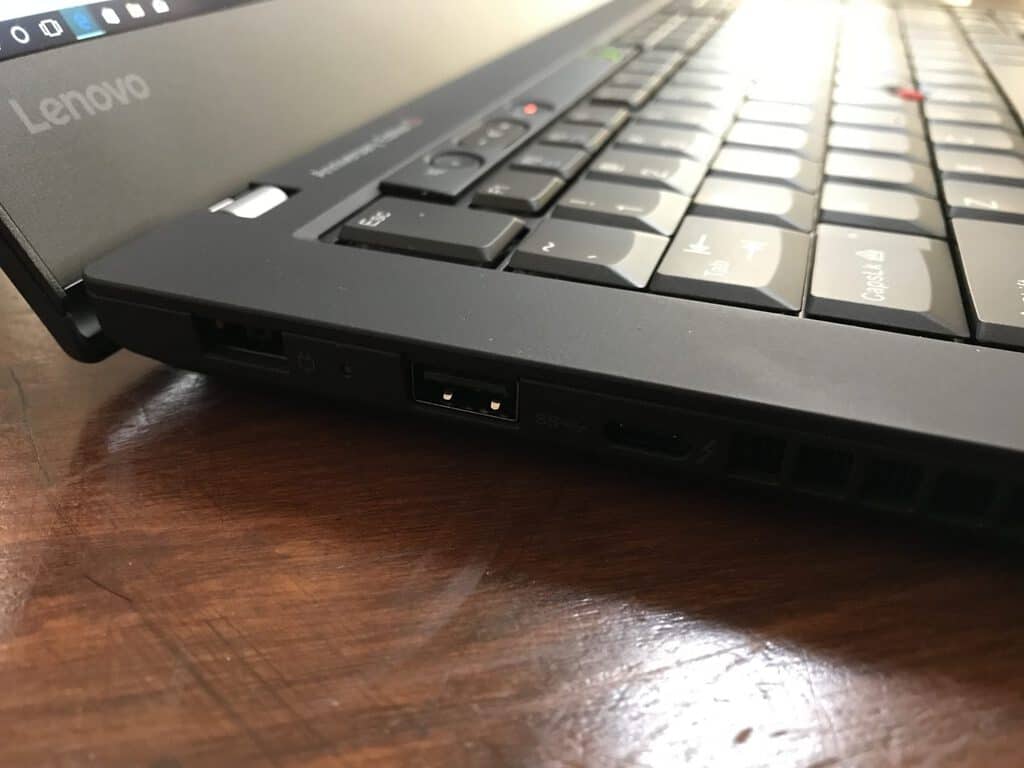 On the left side is a DC-in port, a USB 3.0 Type A port, a USB C port, and an optional Smart Card Reader. Great to see that Lenovo is still including USB 3.0, ports, as more and more laptops these days require USB C, which means shelling out more money for dongles. The USB C port, though, is also a plus since it’s faster and is becoming more common on modern monitors and other devices and accessories. It also can be used for charging and is protected with Anti-Fry technology, great for those times when the DC power adapter can get a bit bulky.