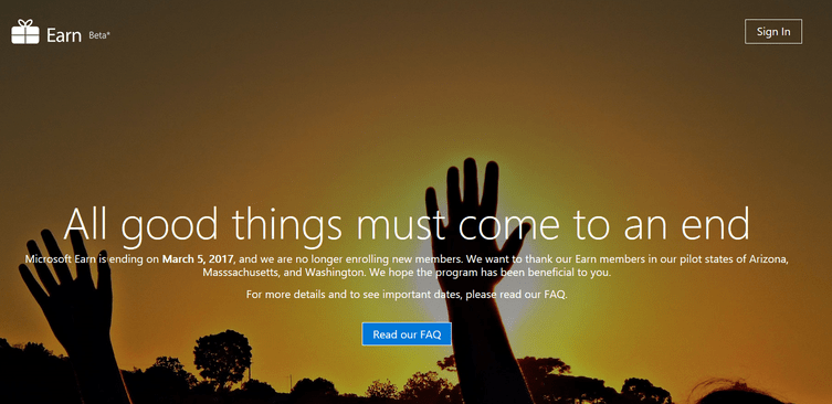 “The Microsoft Earn program is ending on March 5, 2017. We want to thank you for being an Earn member, and we hope the program has been beneficial to you.