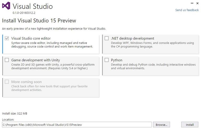 now this is a preview of the nw lightweight installation experience of Visual Studio 2016, the setup is a node app đ pic.twitter.com/ymRceBO0CT
