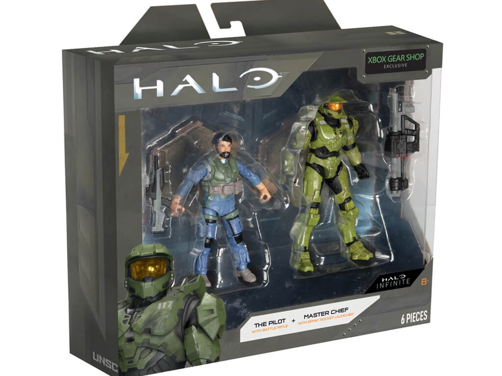 - 2x 4″ World of Halo 4″ scale figures, the Pilot and Master Chief from Halo Infinite