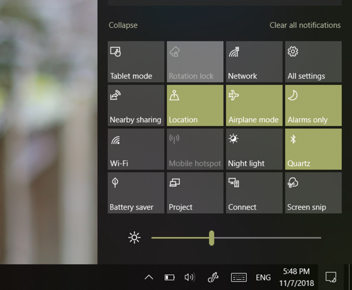Build 18277 brings lots of small changes that I’m sure many people will appreciate, a few of which we’ll find in Action Center. The first thing you’ll notice when opening Action Center in 18277 is the addition of a new kind of control: the brightness slider. Gone are the days of momentarily burning your eyes out at 12 PM while changing your brightness from 25 to 0%. Though it was a minor issue, this is a welcome change. Action center previously had shortcuts, switches, toggles, all mixed together randomly under similarly styled buttons. The slider helps the toggle and its functionality stand out from the other quick actions.