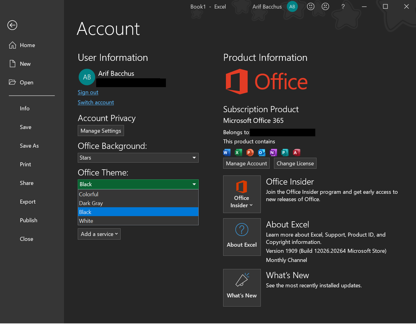 Next, click the Account options on the bottom left-hand corner of the screen. From there, you’ll want to look for the Office Theme drop-down menu. Be sure to click the box and choose Black from the list. After choosing Black, you should notice that most menus inside yout Office 365 app have turned dark. This includes items in the ribbon, as well as the navigation and status bar along the bottom of the screen.