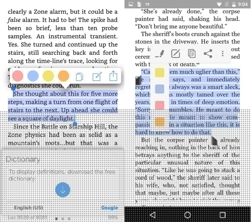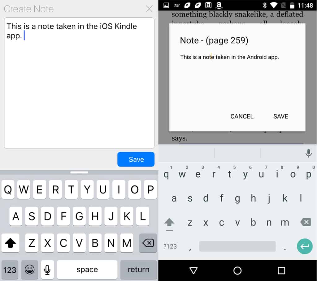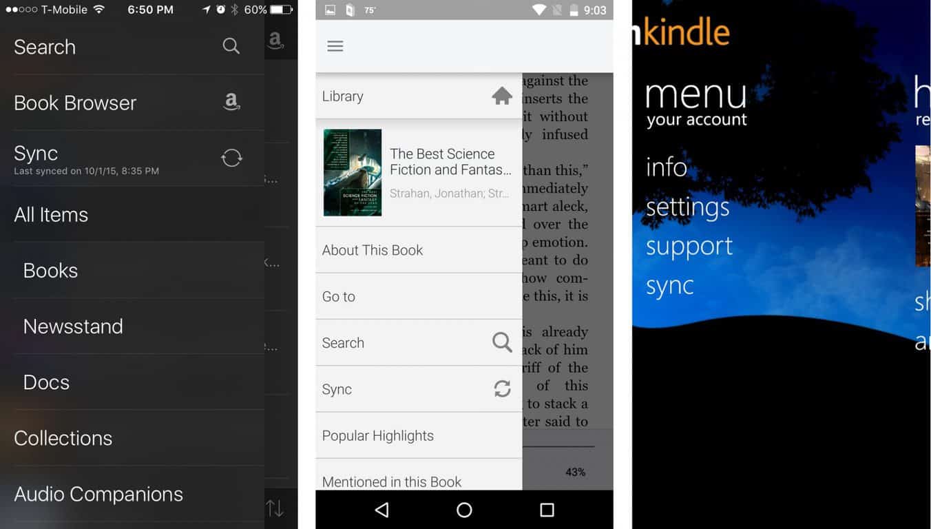 Selecting text in the iOS and Android Kindle apps pulls up a menu that includes the ability to highlight, annotate, copy, and share. Text cannot be selected in the Windows phone Kindle app, and of course none of this functionality is present.