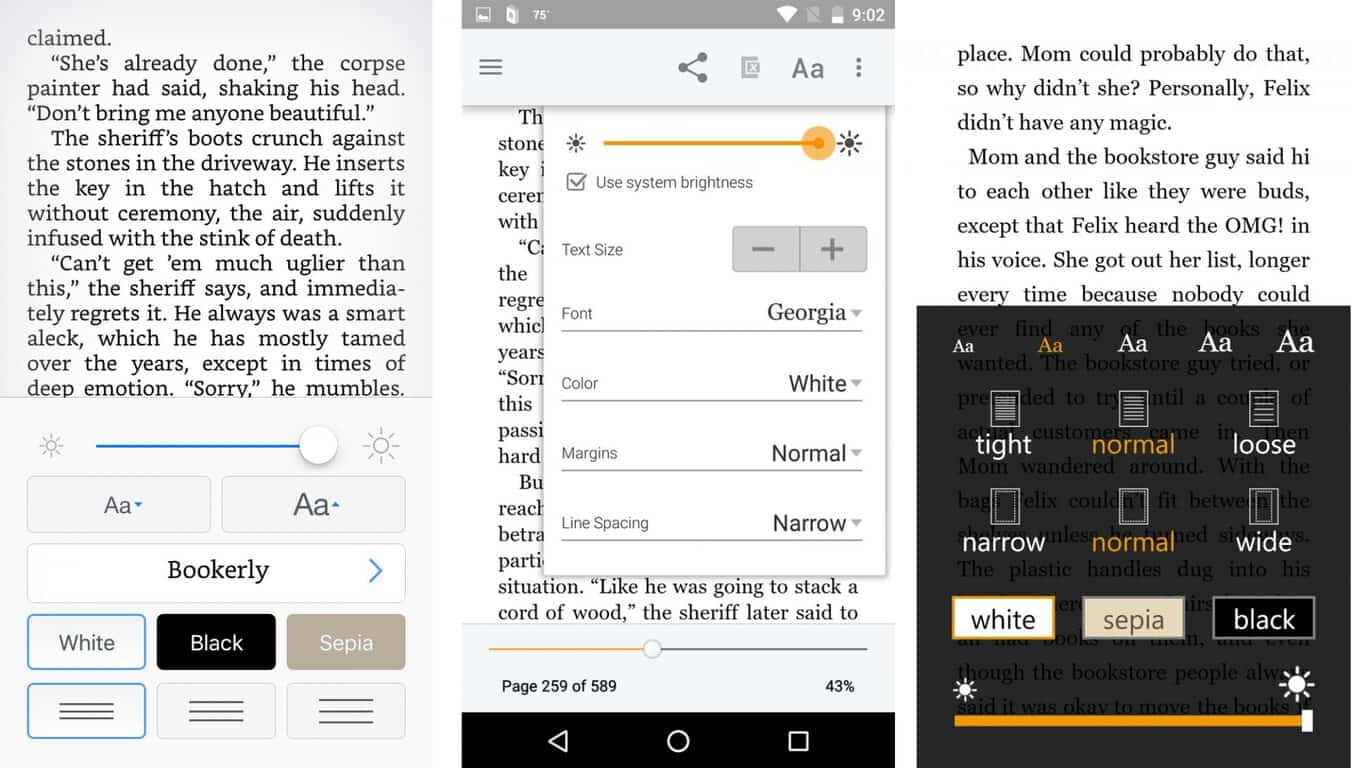 Setting fonts, background colors, and brightness is a similar experience across all Kindle apps.