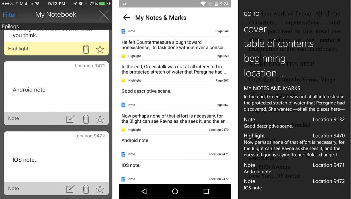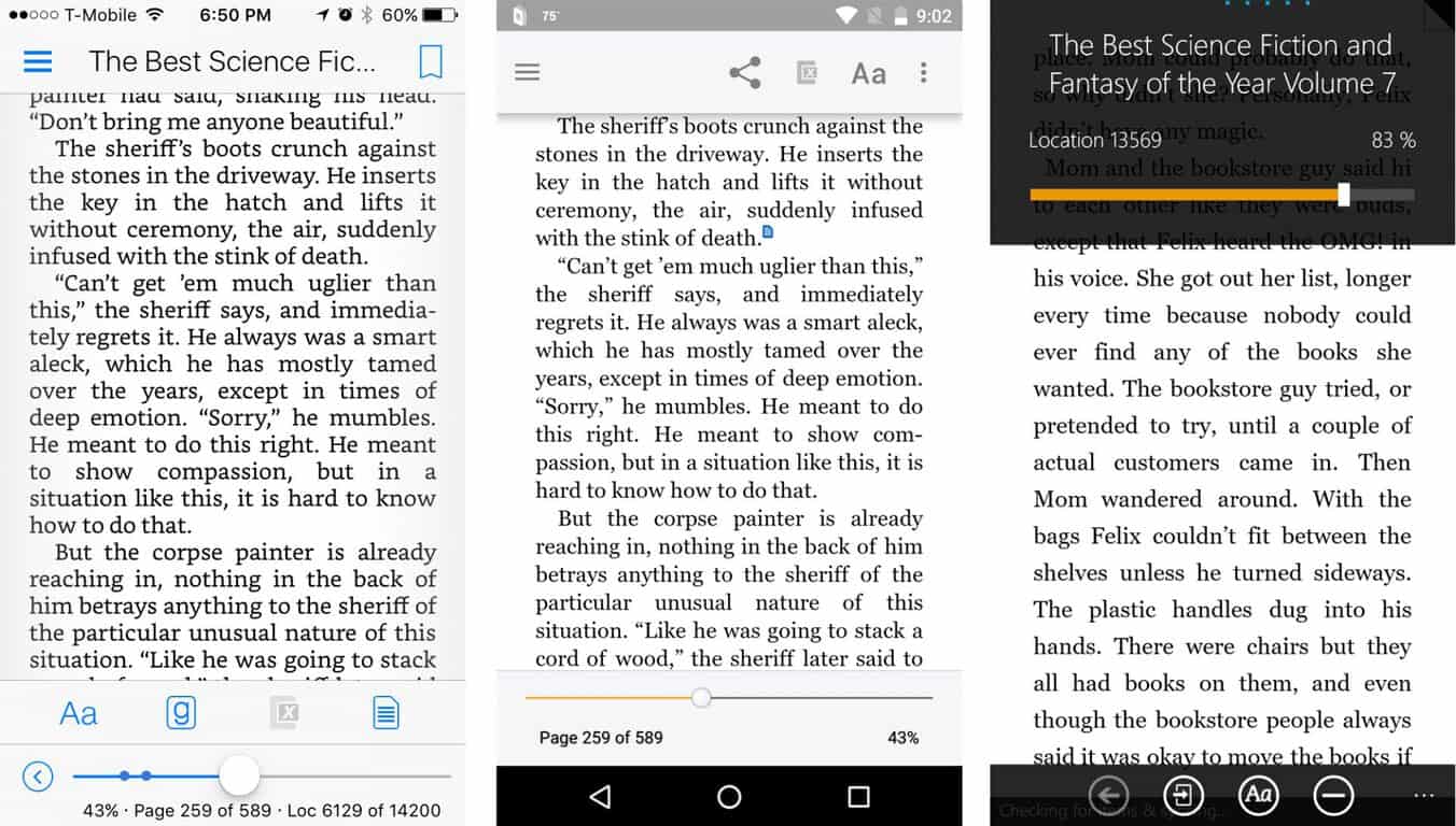 The Windows phone Kindle app allows changing the font and setting a bookmark. That’s it. The iOS and Android apps, on the other hand, enable sharing, annotating, connecting with Goodreads (iOS) — generally, enabling access to a host of features and functionality that the Windows phone app simply does not possess.