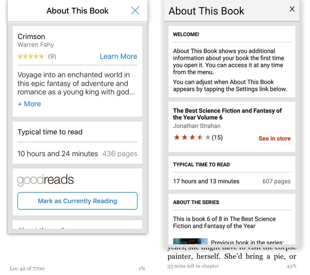 The iOS and Android apps provide some valuable information on the book currently being read, including how much reading time remains before the book is finished. The Windows phone app has no equivalent functionality.