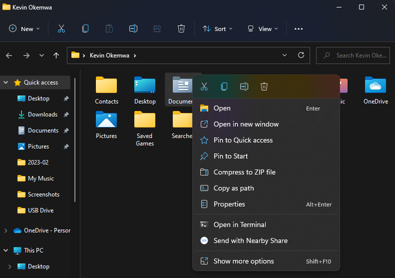 - Key in the following command to launch the location with the user account default folders: %HOMEPATH%