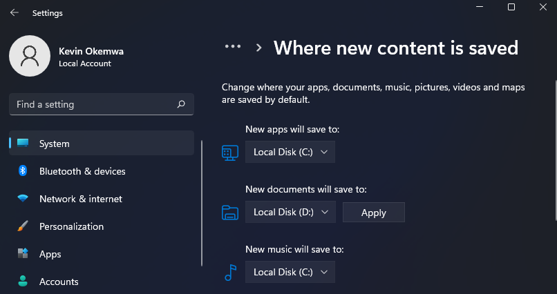 - Under the storage management category, click on the Advanced storage settings dropdown menu, and select where new content is saved.