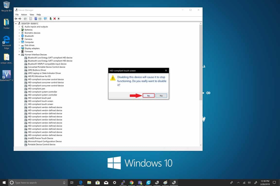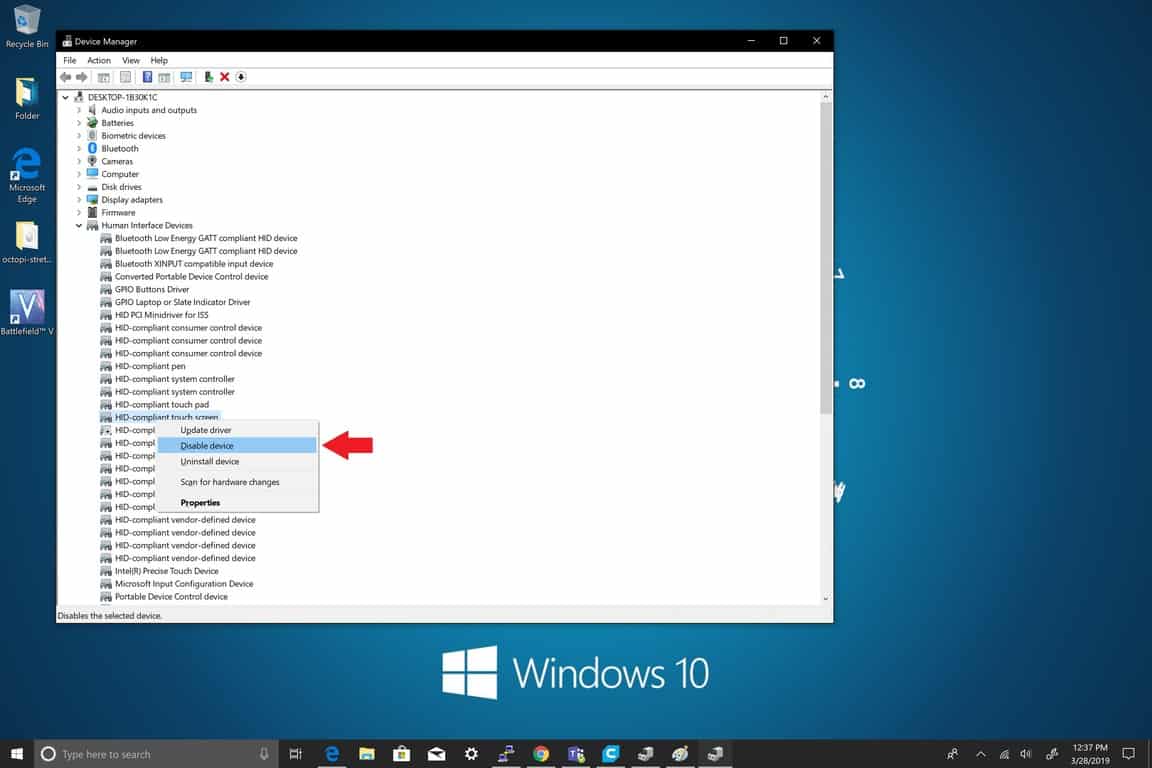 - Right-click HID-compliant touchscreen and choose Disable device.