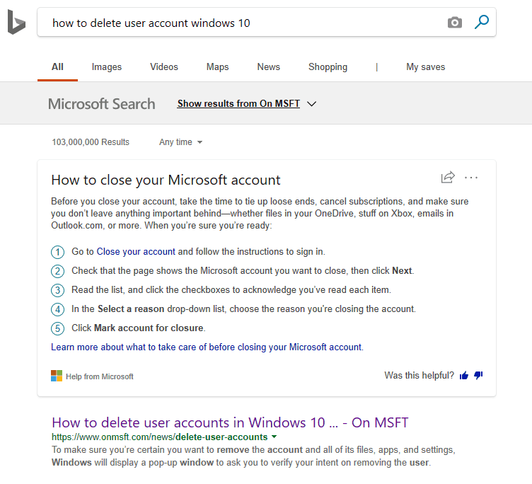 Another way to get answers is by using Bing on Microsoft Edge. You can simple find an answer by opening Edge and typing your question in the URL form. This is especially useful when you have a more complicated answer, because sometimes the answer at the top isn’t always the most relevant. In our case, we asked it “how to delete user account in Windows 10” and instead got a result for how to close an entire Microsoft account. Luckily for you we here at On MSFT already have you covered as you can see our more relevant how to right below.