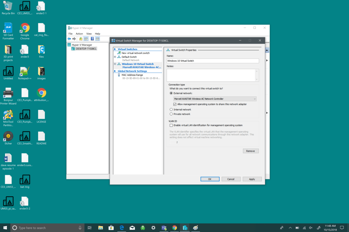 Now, you need to customize your virtual switch. In this example, I used “Windows 10 Virtual Switch.” However, you can name your switch anything you want.