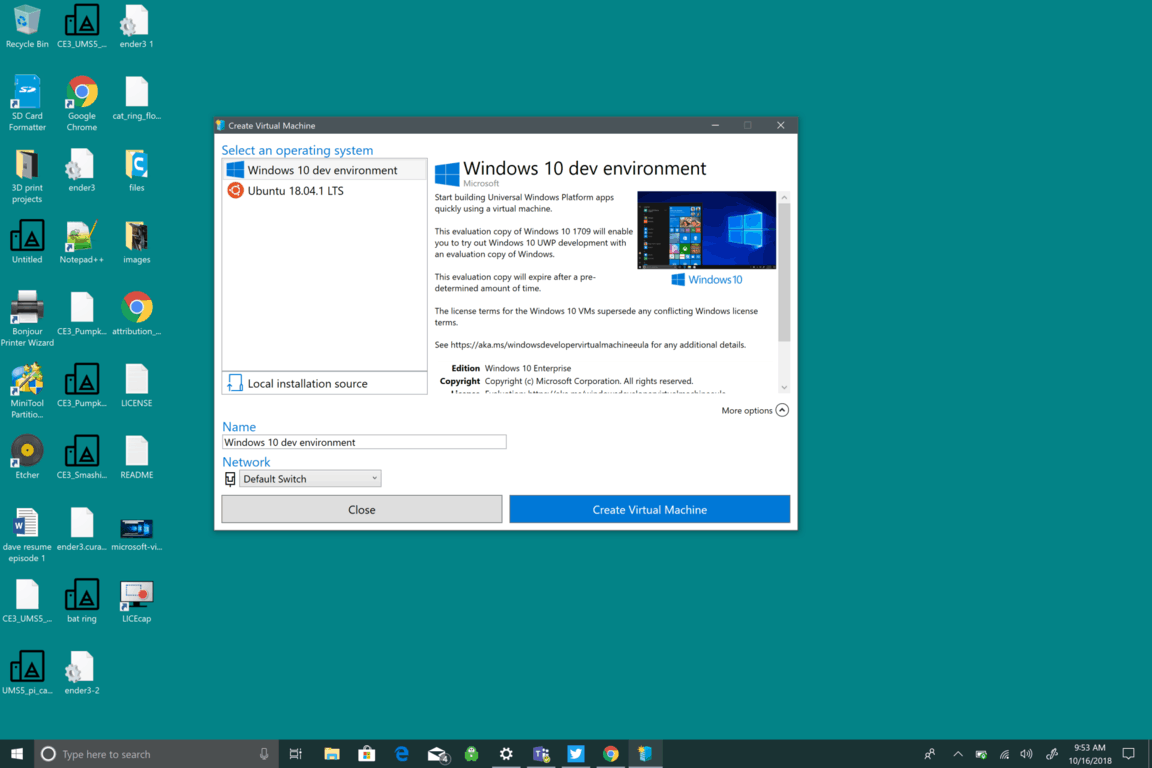 Depending on how you want to set up your VM, the New Virtual Machine Wizard will walk you step-by-step and let you customize your VM on Windows 10 using Hyper-V. In the Windows 10 Fall Creators Update, Microsoft made it even easier to create a VM with Hyper-V Quick Create. Now, you can create a VM using Windows 10 dev environment or Ubuntu 18.04.1 LTS. Quick Create can be launched independently of Hyper-V Manager and is a quick tool to use to create a VM in Windows 10.