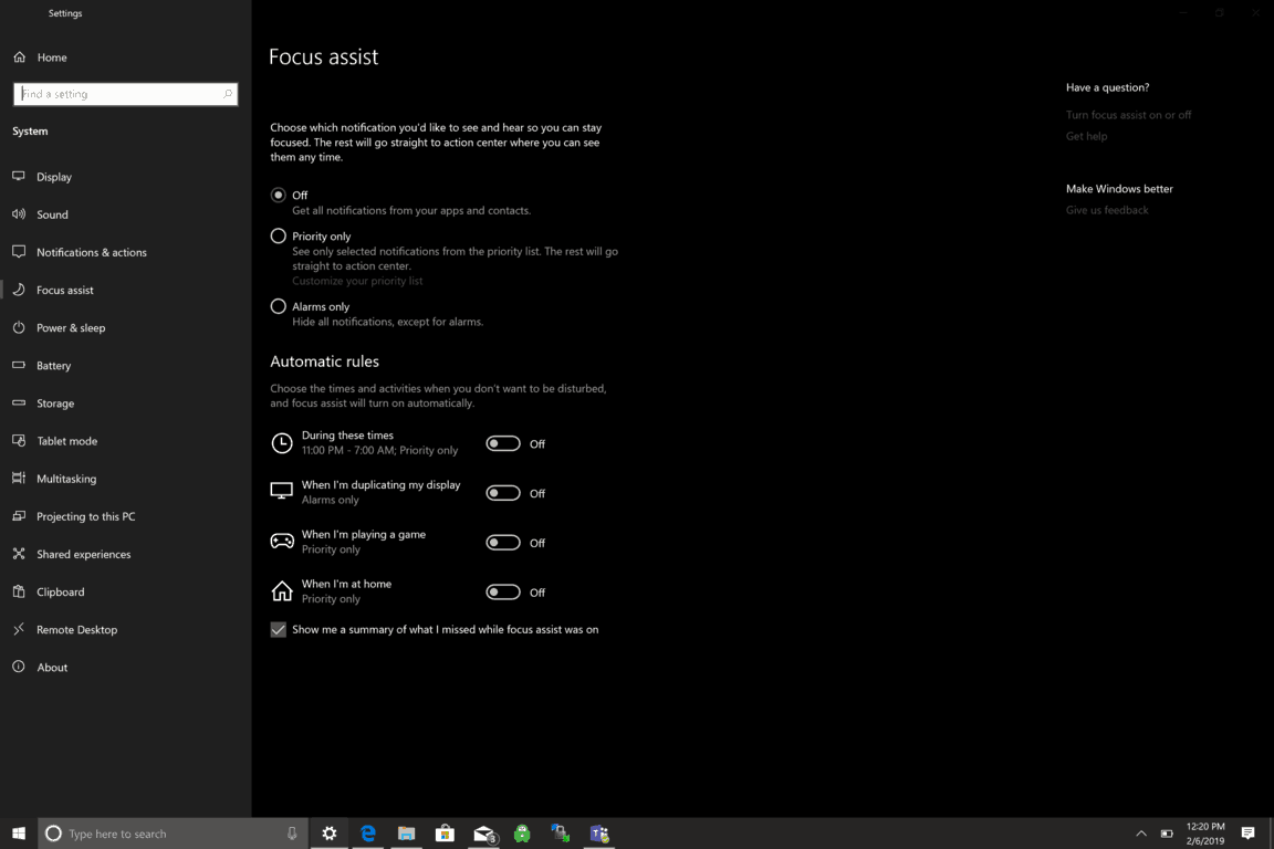 Focus Assist was first introduced early last year as a renamed Quiet Hours, a way to pause notifications when you need to “stay focused.” In order to see Focus Assist settings, go to Settings > System > Focus assist.