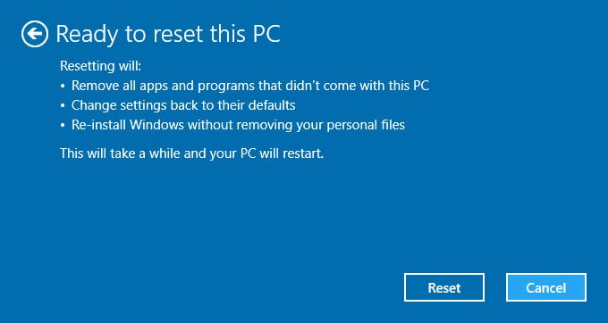 Once Windows is done doing its thing, you’ll now be prompted to “RESET”. This is death trigger time, once you’ve pressed this button there is no going back, so please make sure you have everything you need. I’m not being held responsible for you losing your vast collection of Cat Memes.