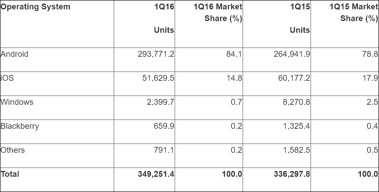 On the one hand, Gartner’s latest global smartphone sales numbers held some relatively good news for the industry: sales were up 3.9% in Q1 2016 over the same period a year ago. A total of 349 million smartphones were sold in the first quarter of 2016, up from 336 million in Q1 2015. On the other hand, there was some bad news as well–sales of Windows phones dropped precipitously, down from an already low 2.5% in the first quarter of 2015 to a paltry 0.7% last quarter.