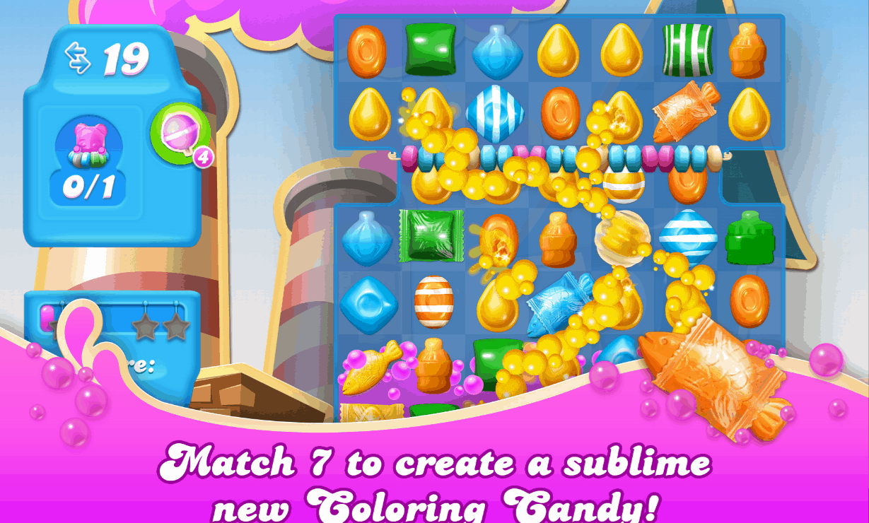 * Scrumptious new candies and sublime new combinations: Match 4 candies in a square to make a Swedish Fish Match 7 candies to create the remarkable Coloring Candy New 8th purple Candy that gives instant and powerful effects when matched
