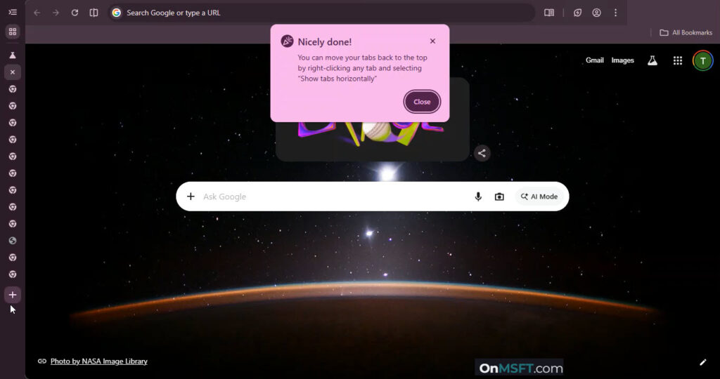 Chrome then displays a confirmation message that reads “Nicely done!” The browser explains that users can move tabs back to the top by right-clicking any tab and choosing “Show tabs horizontally.”