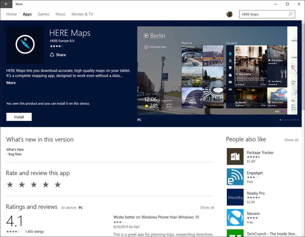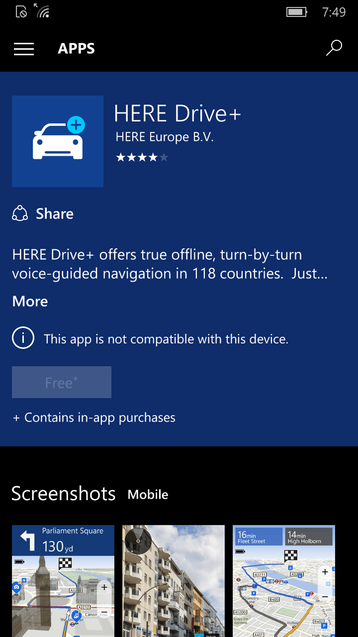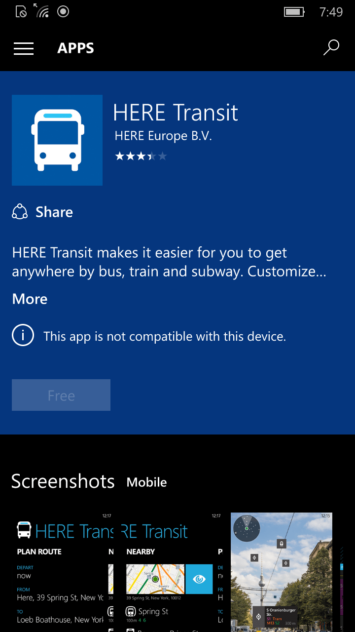 So far, the apps aren’t actually available for download, and they’re a mixed bag in general. HERE Maps only shows up as a PC listing, while HERE Drive+ and HERE Transit are in the Windows 10 Mobile store but tagged with the unfortunate disclaimer “This app is not compatible with this device.”