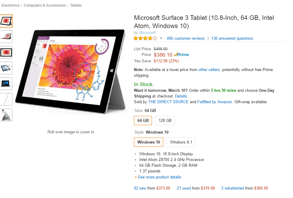 Surface 3, 2GB RAM, 64GB SSD: $386.10 (down from $499.00)