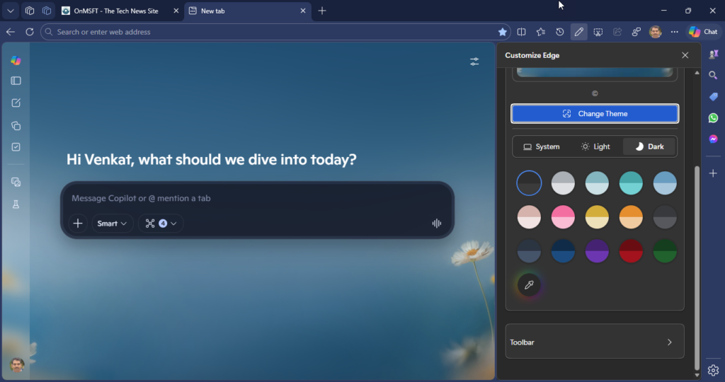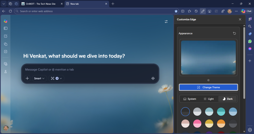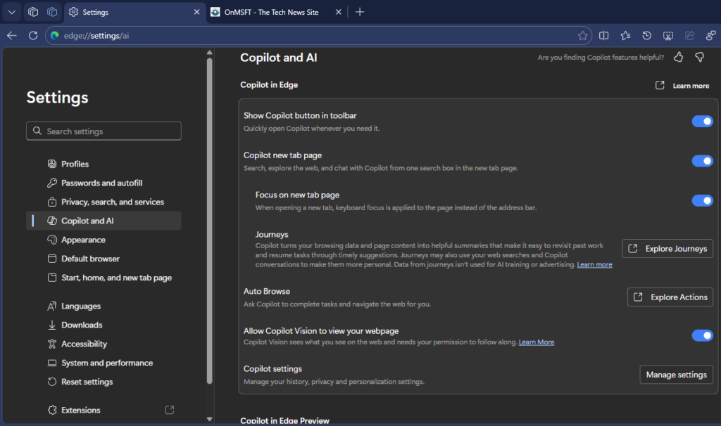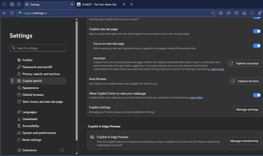 Edge Canary settings with Auto Browse feature and Customize panel for Copilot new tab News