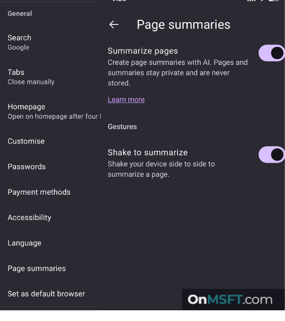 The browser also includes a “Summarise page” option in the three-dot menu under the “More” submenu. Selecting the option triggers the same process without using the shake gesture.