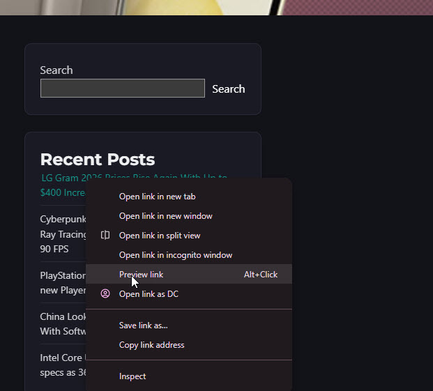 Chrome Link Preview feature showing a webpage in a floating window on desktop News