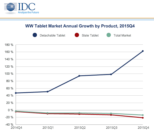 While global tablets shipments arguably tanked in 2015, IDC put an explicit emphasis in its report on the fast growth of detachable tablets, as their shipments more than doubled in the fourth quarter of last year, reaching an all-time high of 8.1 million devices shipped in 2015.