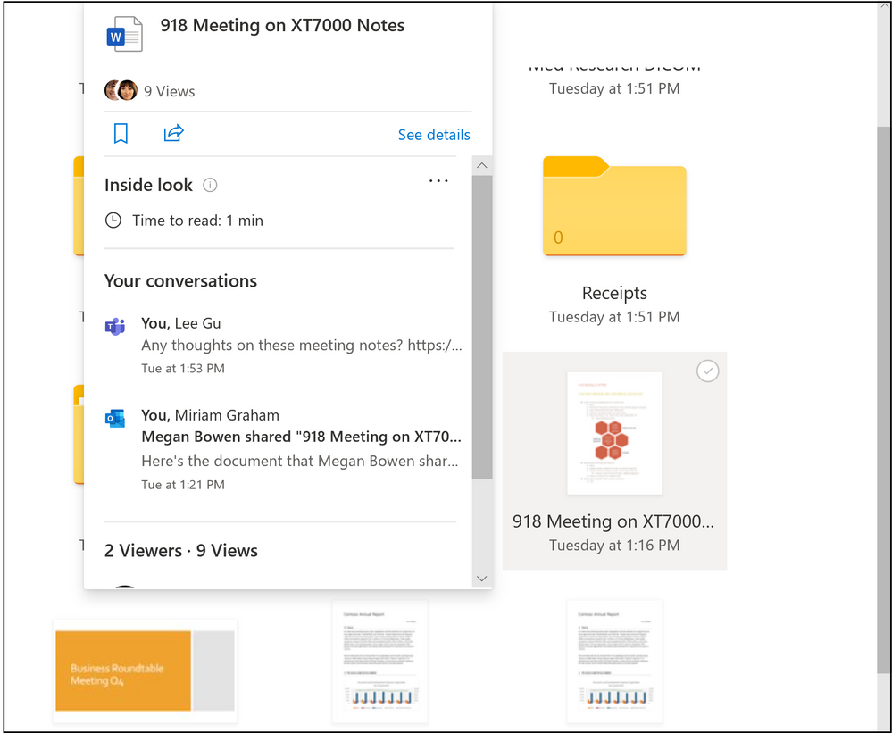 Third, on the list of new OneDrive features is a nifty “conversations” hover ability for SharePoint and OneDrive. Now, when you hover over files shared via email or in Microsoft Teams chats, you’ll be able to see conversations in the file card, allowing you to directly jump to those points in the document. In Outlook specifically, you’ll be able to see @mentions and comment emails in any Office 365 files, allowing you to reply without having to leave Outlook. This also ties in with a “Saved for Later’ feature which will allow you to bookmark files and folders across OneDrive and SharePoint for later access.