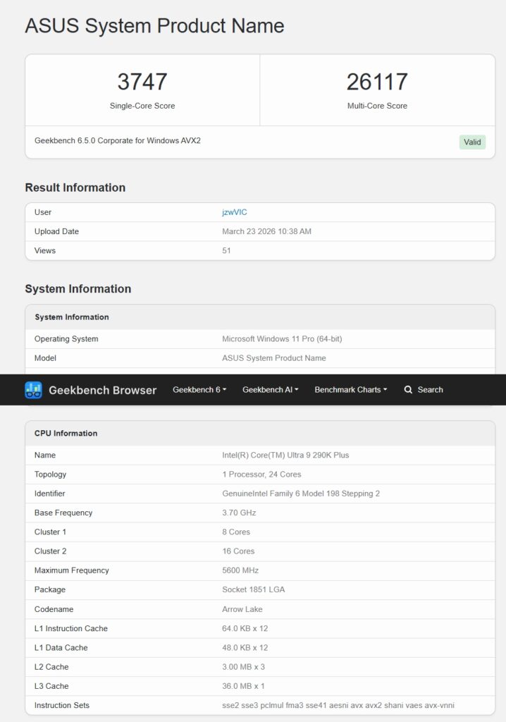 Recent Geekbench results show the Core Ultra 9 290K Plus reaching 3,747 points in single-core and 26,117 in multi-core tests. These numbers place it well ahead of the Core Ultra 9 285K and even above competing high-end CPUs. The improvement now sits close to 17 percent in both categories, which marks a significant jump compared to earlier leaks that showed around 10 to 11 percent gains.