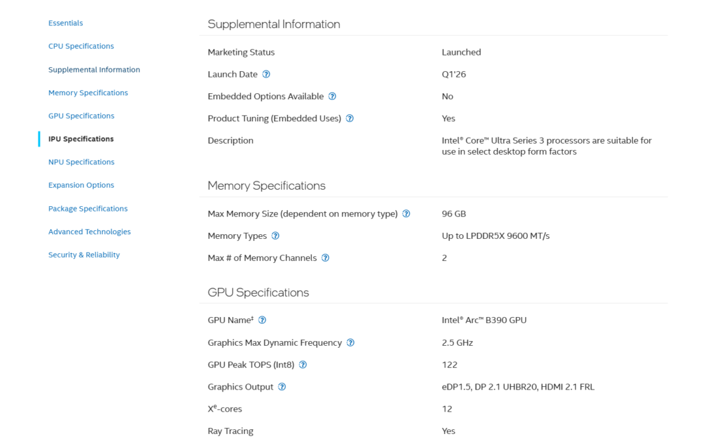 The integrated GPU also remains the same, with Intel including the Arc B390 graphics, which has 12 Xe3 cores and a peak frequency of 2.5 GHz. Memory support reaches up to 96 GB with LPDDR5X speeds of up to 9600 MT/s, which fits well with modern thin and performance-focused laptops.