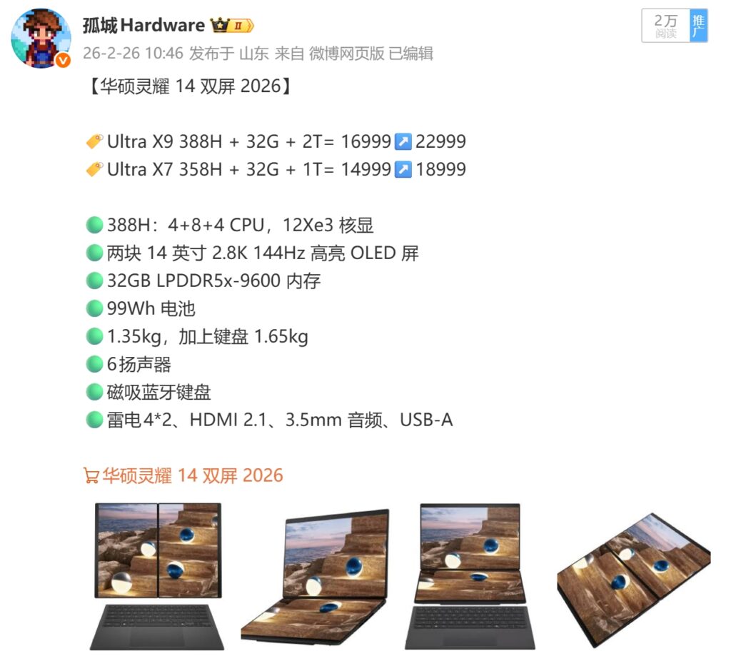 - ASUS Zenbook Duo 14 with Core Ultra X7 358H jumped from 14,999 Yuan to 18,999 Yuan