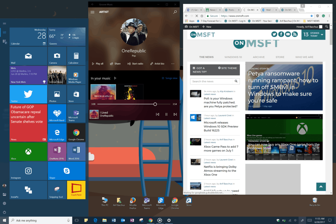 I’m running Windows 10 Creators Update on my desktop, using 3 monitors. On the left I have Tweetdeck for the web open in IE 11, set to 85% zoom to squeeze in a few more columns. In the center monitor, a smaller 21” screen, I run Edge with home page tabs set for MSN.com, onmsft.com (backend) and onmsft.com (site), Google Analytics, Feedly, and Bing.