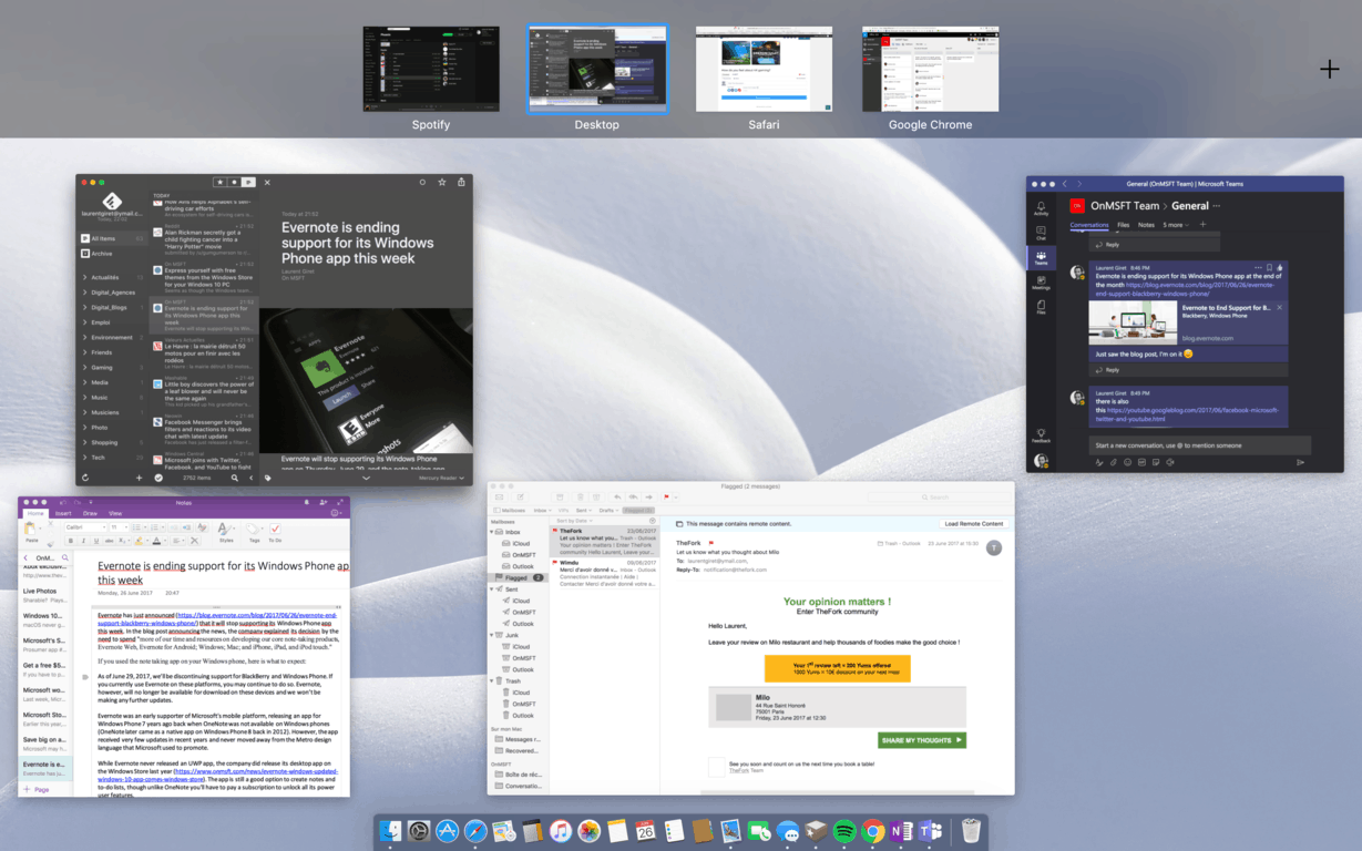 On my desktop, I always keep my email client and RSS reader opened and visible. Then during work, I also keep OneNote and Microsoft Teams close to each other, so I’m able to write articles and follow team chats at the same time. Otherwise, I don’t use many apps as I do pretty much everything in my web browser. There are two other apps that I use from time to time, but not enough to pin them to my dock: PowerPoint for light image editing and Twitter when I want to get news in real time.