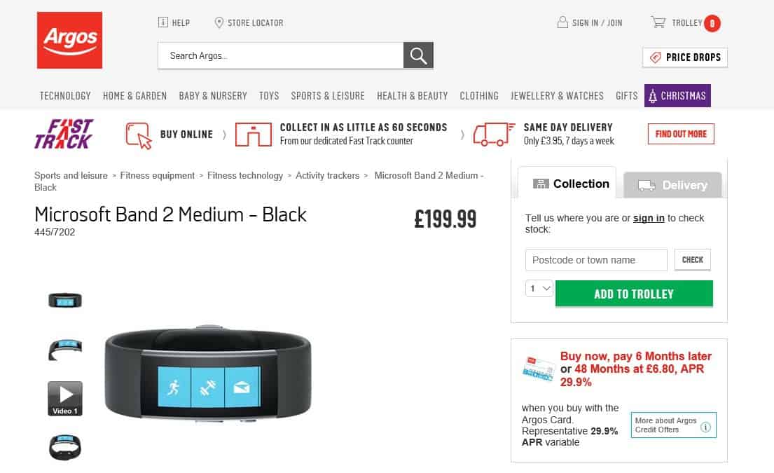 The Argos site has several Microsoft Band 2 options listed for £199.99. Customers can also use an Argos Card to buy now, and pay 6 months later or stretch the purchase over 48 months at £6.80, APR 29.9%.