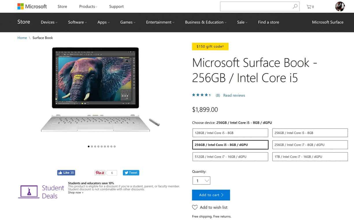 According to listings online from the Microsoft Store, a Surface Pro with 256GB, 8GB RAM and an Intel Core i5 processor are eligible for the $150 gift code as well as Surface Books with similar configurations.