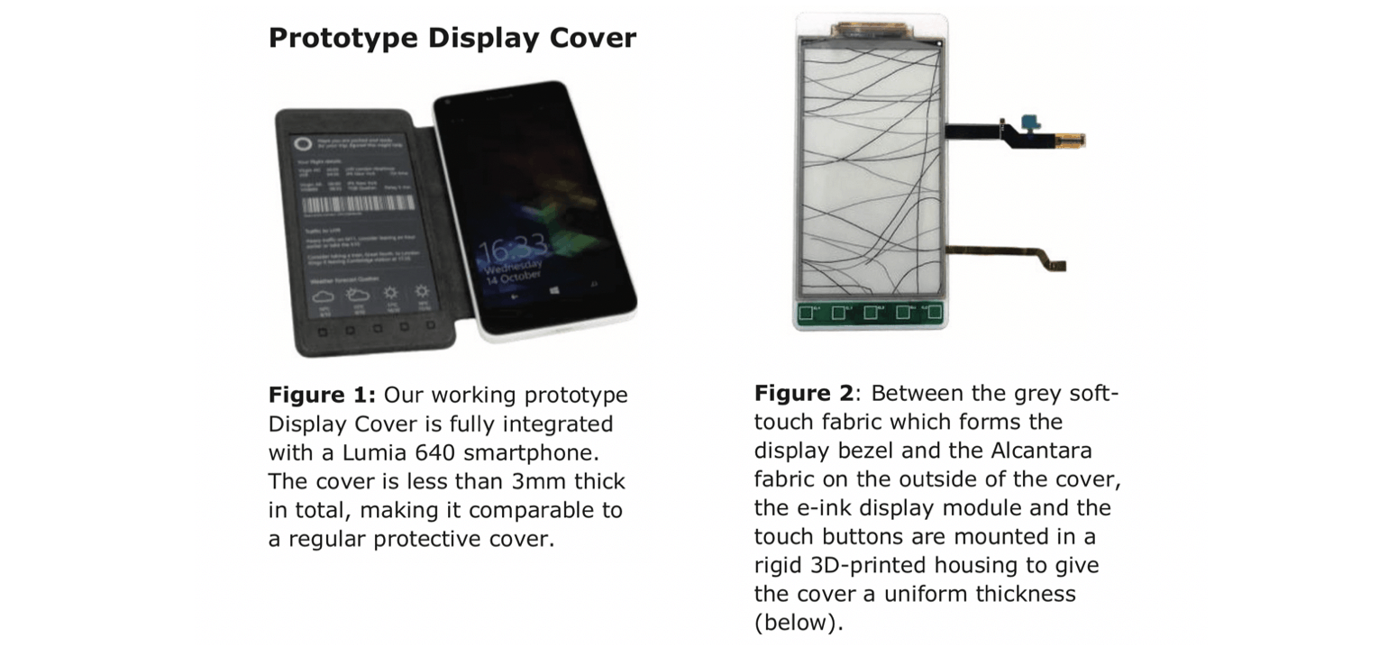 In a Microsoft Research paper that was published earlier this month and then spotted by WalkingCat, the company describes “a concept smartphone Display Cover, a secondary screen designed to improve productivity and convenience.” The prototype that Microsoft built was a flip cover designed for a Lumia 640 Windows phone, and it came with an e-ink (monochrome) display module that could be used to extend Windows Phone apps.