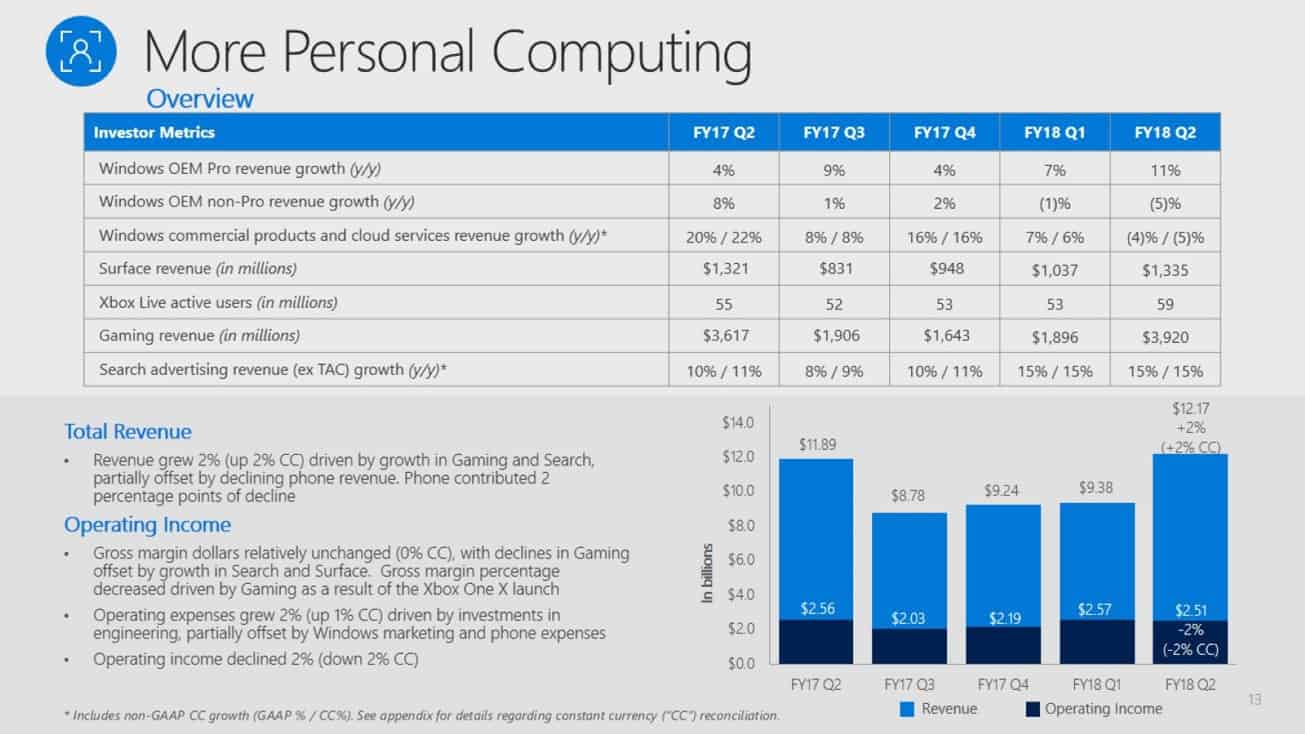 - Gaming revenue grew 8% thanks to having the Xbox One X on the market for the three months ending in December 2017.
