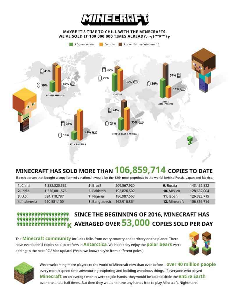 With Minecraft Battle headed to consoles for free later this month, and a new Story Mode episode coming later this week, Microsoft and Mojang are finding new ways to celebrate the over 106,859,714 copies of Minecraft sold to date. According to a Mojang press release, there is a new infographic showing just how far Minecraft has come in the last two years.