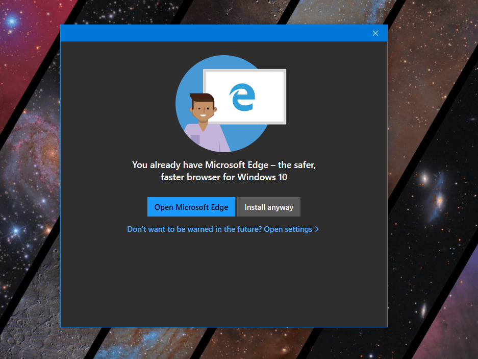 Seen above, the message in this pop-up “ad” is straightforward. Microsoft wants you to know that Edge is the faster, safer browser, designed for Windows. This pop-up won’t stop you from installing your third-party browser, as it gives you the change to “Install Anyway,” but it also gives you the option of opening Edge instead.